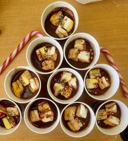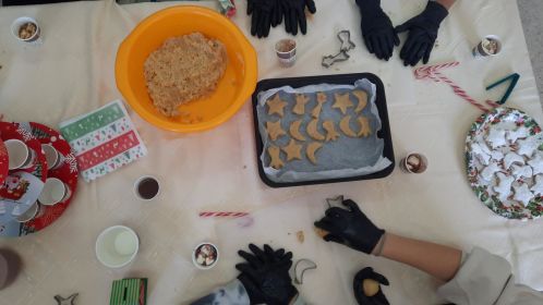 Την Τετάρτη, στις 18 Δεκεμβρίου καθηγητές και μαθητές/τριες γίναμε μια παρέα και από το πρωί ζυμώσαμε, πλάσαμε, σε ευφάνταστα χριστουγεννιάτικα σχήματα, και ψήσαμε τους πεντανόστιμους κουραμπιέδες, στο φουρνάκι του Τμήματος Ένταξης, μια και η ιδέα ξεκίνησε από εκεί. Όσο περιμέναμε να ψηθούν οι κουραμπιέδες, τα παιδιά μαζί με τους εκπαιδευτικούς του Τμήματος Ένταξης ετοίμασαν ζεστή σοκολάτα. με ζαχαρωτά και χρωματιστές τρούφες, την οποία όλοι μας απολαύσαμε, με ιδιαίτερη χαρά. Όταν οι κουραμπιέδες ψήθηκαν, κεραστήκαμε μεταξύ μας ,αλλά κεράσαμε και τους γονείς, που βρίσκονταν στο σχολείο και το βοηθητικό προσωπικό. Εκείνη την ημέρα νιώσαμε, με ξεχωριστό τρόπο, τη ζεστασιά, που φέρνει η γέννηση του Χριστού στις καρδιές μας.