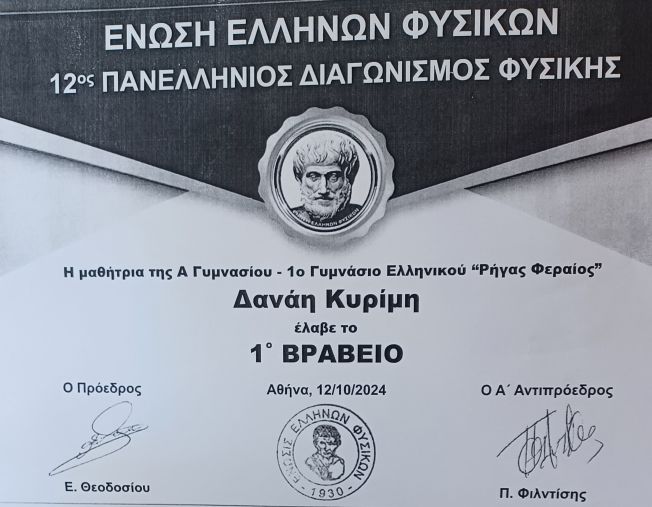 Βράβευση Μαθήτριας στον 12ο Πανελλήνιο Διαγωνισμό Φυσικής